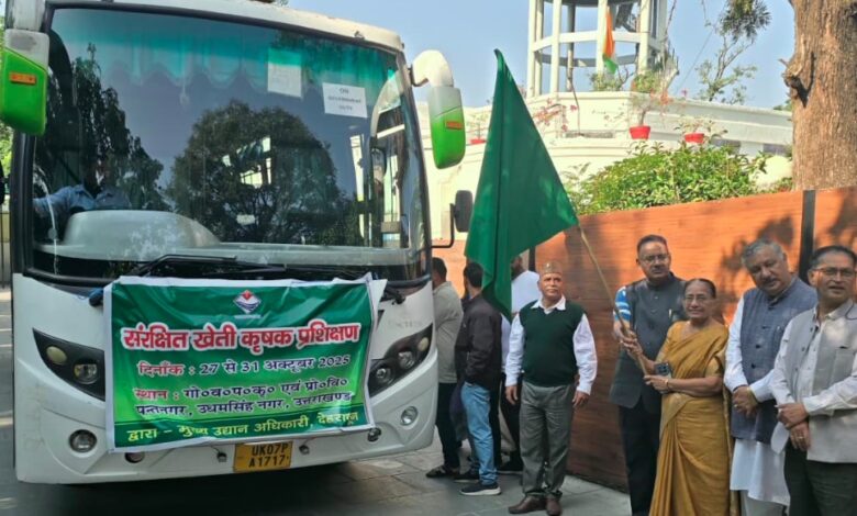 देहरादून: जनपद देहरादून के 28 प्रगतिशील सब्जी उत्पादक कृषकों के समूह को प्रदेश के कृषि एवं उद्यान मंत्री गणेश जोशी ने आज गोविन्द बल्लभ पंत कृषि एवं प्रौद्योगिकी विश्वविद्यालय, पंतनगर में पांच दिवसीय संरक्षित खेती पर प्रशिक्षण हेतु बस को हरी झंडी दिखाकर रवाना किया।