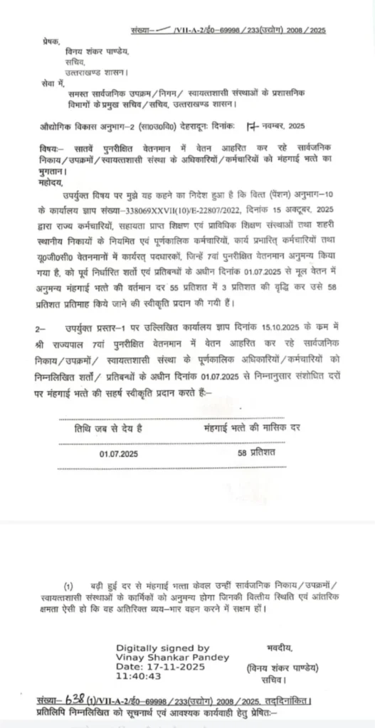 देहरादून: मुख्यमंत्री पुष्कर सिंह धामी के नेतृत्व में राज्य सरकार ने कर्मचारियों को बड़ी राहत देते हुए महंगाई भत्ते (DA) में 3 प्रतिशत की वृद्धि को मंजूरी दे दी है। धामी सरकार लगातार कर्मचारियों के हितों के प्रति गंभीर रही है, और उसी क्रम में सातवें पुनरीक्षित वेतनमान में वेतन आहरित कर रहे सार्वजनिक निकायों, उपक्रमों व स्वायत्तशासी संस्थाओं के अधिकारियों–कर्मचारियों के लिए DA को 55% से बढ़ाकर 58% किए जाने का निर्णय लिया गया है। नई दरें 1 जुलाई 2025 से लागू होंगी।