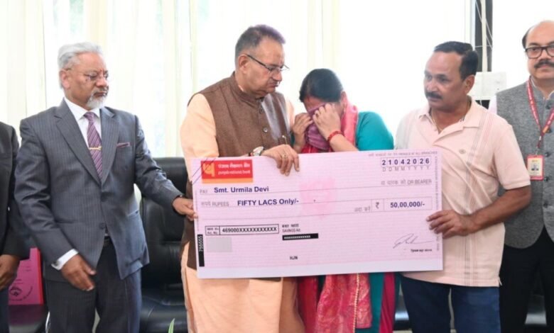 देहरादून: सैनिक कल्याण मंत्री गणेश जोशी ने अपने कैंप कार्यालय में दिवंगत उपनल कर्मचारी कविता गुसाईं के परिजनों को उपनल द्वारा पंजाब नेशनल बैंक के सहयोग से ₹50 लाख की शेष बीमा राशि का चेक प्रदान किया। इस दौरान दिवंगत कर्मचारी की आत्मा की शांति के लिए दो मिनट का मौन रखकर श्रद्धांजलि अर्पित की गई।