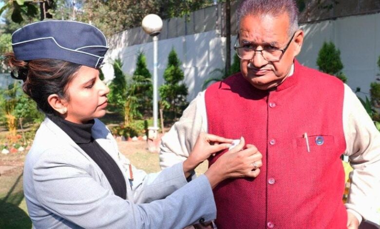 सशस्त्र सेना झंडा दिवस पर सैनिक कल्याण मंत्री गणेश जोशी को लगाया फ्लैग