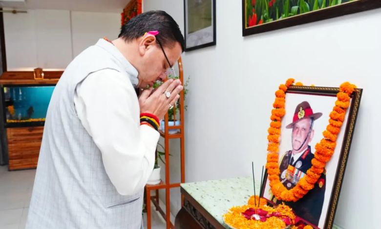 देहरादून: मुख्यमंत्री पुष्कर सिंह धामी ने भारत के प्रथम चीफ ऑफ डिफेंस स्टाफ, पद्म विभूषण से अलंकृत तथा उत्तराखंड के गौरव, जनरल बिपिन रावत की जयंती पर मुख्यमंत्री आवास में उनके चित्र पर श्रद्धा सुमन अर्पित कर भावपूर्ण स्मरण किया।