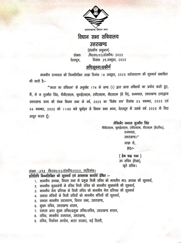 उत्तराखण्ड के राज्यपाल लेफ्टिनेंट जनरल गुरमीत सिंह (से.नि.) ने संविधान के अनुच्छेद 174(1) के तहत प्रदत्त शक्तियों का प्रयोग करते हुए राज्य की पंचम विधानसभा का वर्ष 2025 का विशेष सत्र आहूत किया है।राज्यपाल की अधिसूचना के अनुसार, यह विशेष सत्र 3 और 4 नवम्बर 2025 को पूर्वाह्न 11 बजे से देहरादून स्थित विधानसभा भवन में आयोजित होगा।